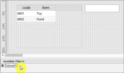 Click the mouse anywhere on the design screen. Since the Dataset object is not displayed on the screen, the location where it is placed has no meaning. When you click the mouse, the Dataset object is added to the [Invisible Object] area.