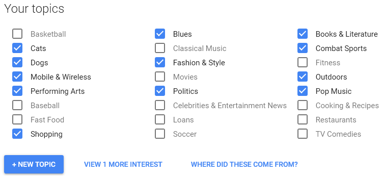 The following is the advertisement setting screen of Google. The user can select and receive only the advertisements he/she wants to receive among the advertisements classified by topic. Here, you can see that the checkboxes are used to indicate the user selection or when receiving input.