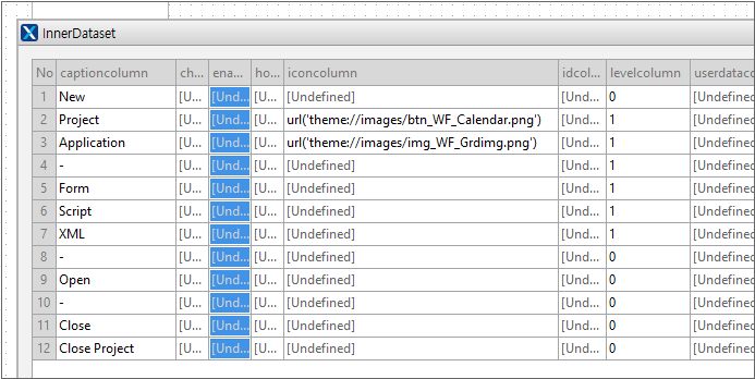 Set the innerdataset property value of the PopupMenu component as follows. The values you need to enter are captioncolumn, levelcolumn values.