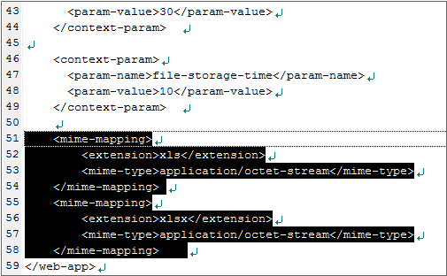 エクスポートの作業完了時にダウンロードされず(ダイアログが表示されず)、ブラウザ上にファイルの内容が壊れた状態で表示された場合、web.xmlにmime-mappingを追加した後にWASを再起動します。