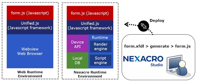 実行環境(Runtime Environment) :モバイルアプリ、デスクトップアプリでは、オープンソース・ベースに独自開発したレンダリングエンジンとスクリプトエンジンで構成されたnexacro実行環境(NRE、nexacro runtime environment)を使用します。最適化された実行環境を提供して、大容量のデータを扱うか、複雑な画面構成時Webブラウザよりも高速に処理します。また、OSからサポートされるさまざまなAPIとデバイスを連動することができます。