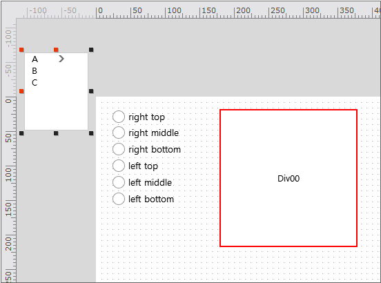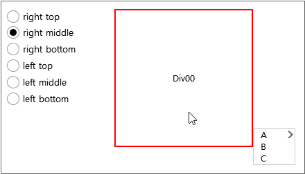 팝업 메뉴를 보여주는 좌표점에서 팝업 메뉴의 가로, 세로 정렬 방식을 지정합니다. default 값은 "right bottom"입니다. 이때 사용하는 방향은 좌표점을 기준으로 생각해야 합니다. 좌표점이 Div 컴포넌트의 오른쪽 아래 꼭지점이라면 default 정렬값을 적용해 해당 꼭지점 오른쪽 아래에 팝업 메뉴가 나타납니다. 반대로 정렬값을 "left top"이라고 설정한다면 아래 그림과 같이 Div 컴포넌트 안쪽에 팝업 메뉴가 나타납니다.