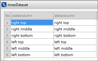 속성창에서 innerdataset 항목을 찾아 innerdataset 편집창을 실행합니다. 화면에 A, B, C 3개의 메뉴 항목을 표시하고 A 항목을 선택하면 A-1, A-2 2개의 메뉴 항목이 표시되도록 하겠습니다. innerdataset 편집창을 실행하면 입력할 항목이 많은데 이 중에서 captioncolumn, levelcolumn 2개 속성값만 지정합니다.
