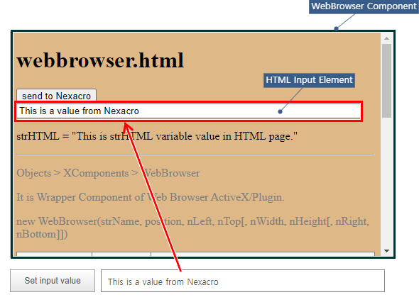 Set input value 버튼을 누르면 화면의 Edit 컴포넌트의 "This is a value from Nexacro." 텍스트가 WebBrowser 컴포넌트에 로딩된 웹 페이지의 Input 엘리먼트에 설정됩니다.