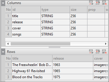 4개의 칼럼 데이터 외에 버튼 기능을 할 셀 2개를 추가합니다. displaytype 속성값은 "imagecontrol"으로 지정하고 text 속성값에 표시할 이미지 경로를 지정합니다. 예제에서는 테마에 있는 이미지를 사용했습니다. 해당 셀을 사용자가 클릭했을때 이벤트를 처리하기 위해서는 셀 id 값을 알아야 합니다. 셀을 선택하고 속성창에서 id 속성값을 확인하거나 수정할 수 있습니다.