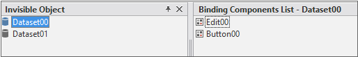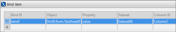 Clicking the [binds check] button displays the Bind item list in the TextArea component in the Form object. Components that set binding directly to the binddataset property like the Grid component are not displayed.
