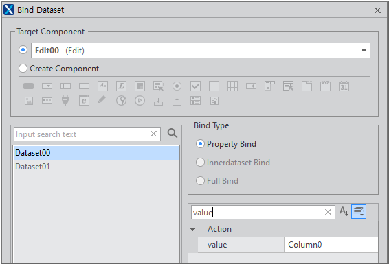 In the Bind Dataset pane, select the Target Component, find the properties, and enter the values as shown below.
