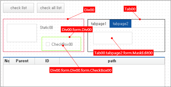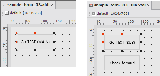 In the second Form, 2 Button components are placed. When the [Go TEST (SUB)] Button component is clicked, it moves to the specified screen, and when the [Check formurl] Button component is clicked, it shows the formurl property value (or the url property value of the container component) of the ChildFrame object.