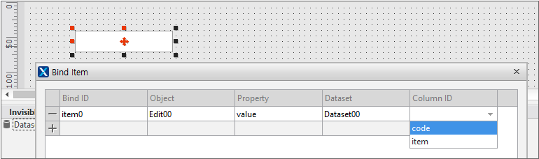 The [Bind Item] setting window is displayed when you release the left mouse button that was held on the Edit component. In the [Bind Item] setting window, select the property to be bound in the Edit component and the column to be bound in the Dataset object.