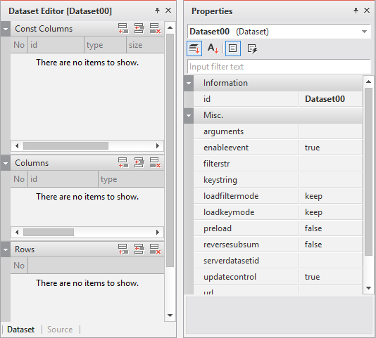 [Dataset Editor] is executed on the left side of the property window. Click the Add Data icon in the [Rows] item under [Dataset Editor].