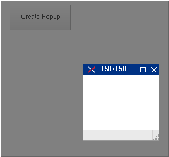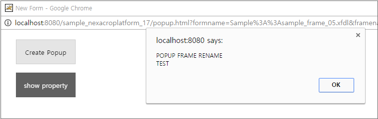 When the "Create Popup" button is clicked, the open method is executed. The same Form is recycled without creating a separate Form. The property value is transmitted as the 4th parameter. The name property among the transmitted property values overwrites the original property value of the ChildFrame object, and the uname property creates a new property and sets the property value.