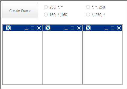 If you select the item of the Radio component, the width of the placed ChildFrame changes. If the value is specified as numbers, then the width is modified in px unit, and if it is specified as * characters, the rest is calculated and processed, excluding the width specified as numbers. For example, if the width of HFrameSet is 400 and the separatesize property value is set to "250, *, *", then the width of the first ChildFrame becomes 250 and the width of the rest of ChildFrame becomes (400-250)/2. When calculating the actual value, the border property and other properties must also be considered, and the numbers may vary.