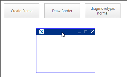Create ChildFrame and change the style property or change whether to support dragging. Click the [Create Frame] button to display the pop-up window and click the [Draw Border] button to display the border of the pop-up window. At this time, you can freely move the pop-up window by holding the window title area, but if you click the [dragmovetype] button, the dragmovetype property value changes and the window does not move. Click the [dragmovetype] button again to move the pop-up window again.