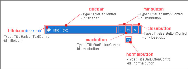This is the area where text and icons are displayed in the title bar area. You can change the icon image and text properties. You can check the sub-properties in the TitleBarIconTextControl object.