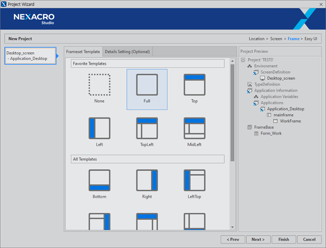 Even if you do not select the Frame structure when creating the project, the Frame structure can be changed after the project is created. Various templates are provided, but if they are not the desired form, then you can select "None" and modify them in the desired form in the Frame editing window.