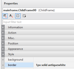 Information about the setter of ChildFrame can be found in the ChildFrame property item in the help; however, the border property is not shown. In the help, the property name is -nexa-border, not border. In the case of the border, since the name used in the script and the name specified in XCSS are different, the property name display is based on XCSS.