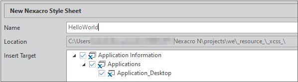 Set the XCSS name, path, and application target on the New Style Sheet screen.