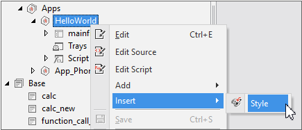 Select the Application name in Project Explorer as follows, click the right mouse button, and select [Insert > Style] from the context menu.