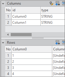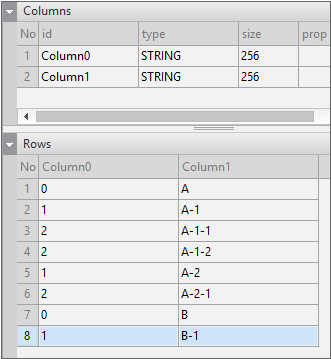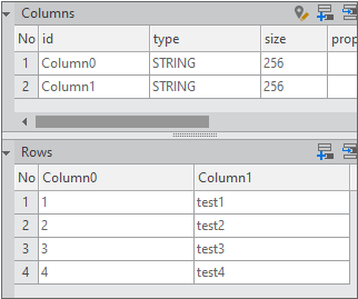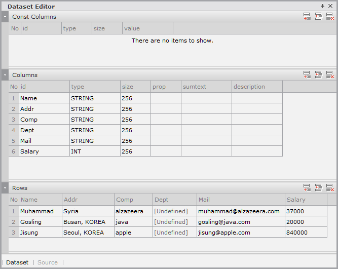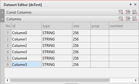 Enter the data item list in the created Dataset. If you double-click Dataset00 in the Invisible Objects area, then the Dataset editor appears. Enter columns and rows as shown in the figure below.