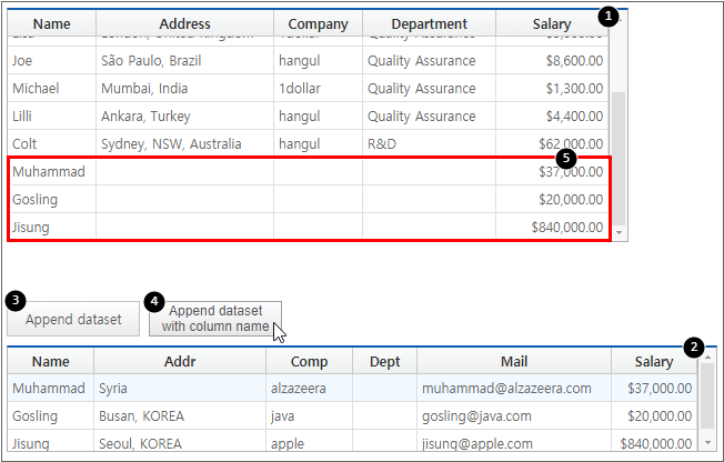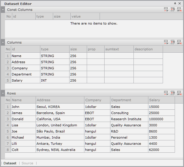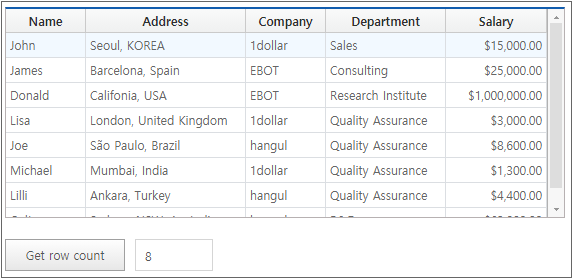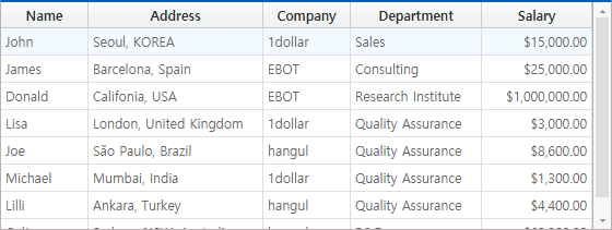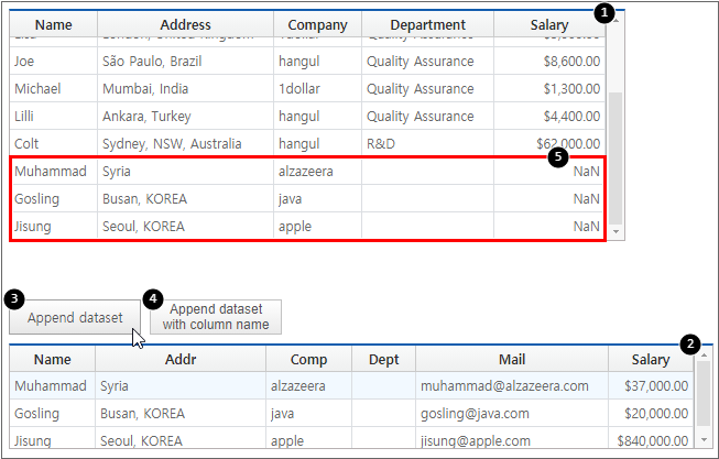 The following is an example of binding Dataset with Name, Address, Company, Department, Salary information to the Grid component.