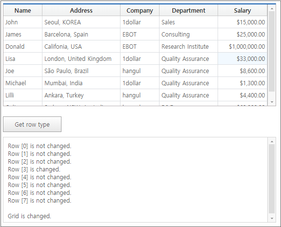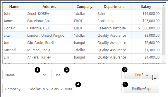 The following is an example of searching for desired data using the findRow, findRowExpr methods in Grid. The findRow and findRowExpr methods return the index of the searched record. In the example, the focus is moved to the index so that the user can recognize it immediately.