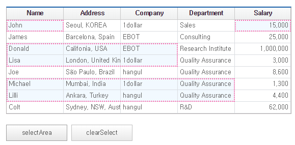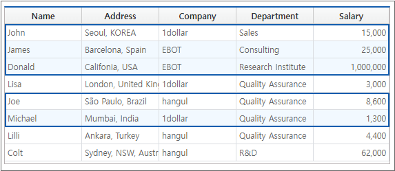 The selectMultiRow method adds a selection area while maintaining the previously selected area. For example, if the selection range is set to "0, 2" for the first run and "4, 5" for the second run, the selected state is displayed as follows.