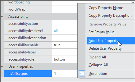 Add User Property to the Button component with the name "nVoffsetpos" and set the values -1 and 1 respectively.