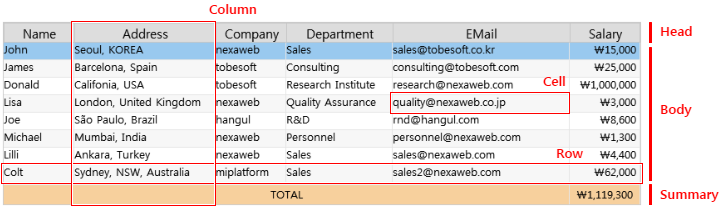 Grid is the component that expresses data in the form of a grid-shaped table and is used to list data in an orderly manner. You can simply show the data or process the operation internally, and you can change the shape and show it in the desired format.
