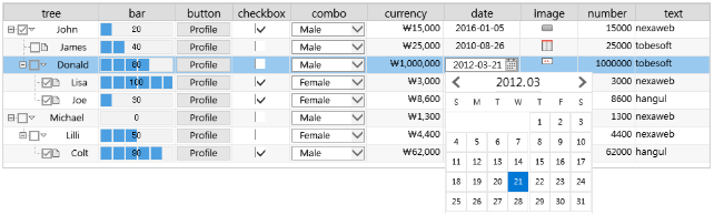 Cell is one of the objects that configure Grid and has separate properties from Grid. It can be used by binding the Dataset column, or by setting the displaytype, edittype properties of the cell, it can be expressed in the form of components such as Button, Combo, CheckBox, Image, ProgressBar, Edit, etc., or it can be expressed in the form of a tree.