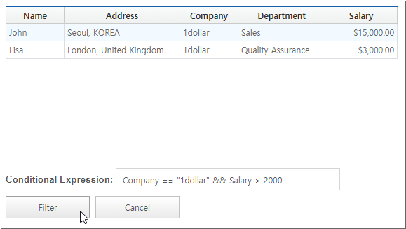 The user enters Conditional Expression and clicks the Filter button to check the filtered results in Grid. Clicking the Cancel button removes the filtering and returns to the original data.