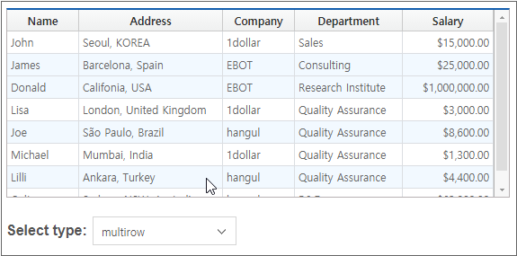 If the selecttype property value of the Grid component is set to "multirow", multiple rows can be selected. However, if there are many rows to select or if you need to quickly select a row in a specific position, you can set the row index to select and execute the method.