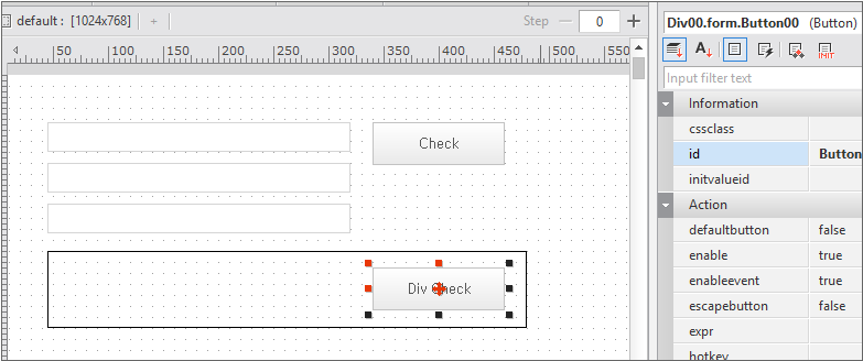 [Check] 버튼 클릭 시 Form의 id, titletext 속성값, Button 컴포넌트의 부모 오브젝트의 id 속성값을 Edit 컴포넌트에 표시합니다. [Div Check] 버튼 클릭 시에는 활성화된 화면(Form)은 Div 내 innerForm 이지만 getActiveForm 메소드에서는 Div 컴포넌트를 포함하고 있는 Form 오브젝트를 반환합니다.