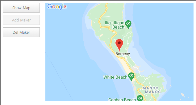 Show Map 버튼을 클릭하면 화면에 보라카이 지도가 출력되며 마우스와 키보드를 이용해 지도를 이동 및 확대/축소할 수 있습니다. Add Marker 버튼을 클릭하면 화면에 마커를 추가하고, Del Marker 버튼을 클릭하면 마커를 삭제합니다.