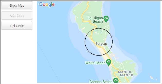 다음은 구글 지도에서 필리핀의 보라카이 섬(위도 11.96832946, 경도 121.922996308)을 출력하고 같은 좌표에 원을 표시하는 예입니다. 예제의 버튼은 각각 다음과 같은 기능을 합니다.