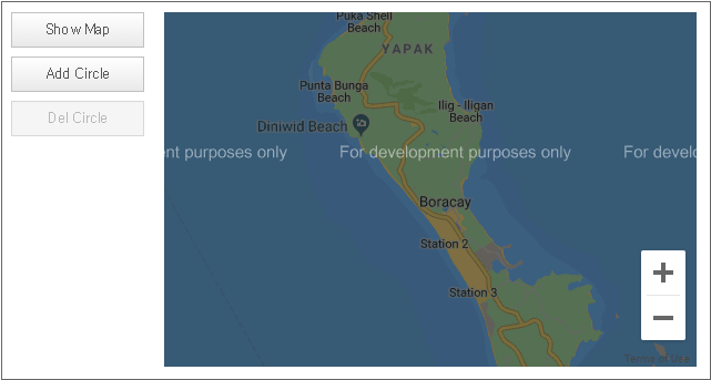 Show Map 버튼을 클릭하면 화면에 보라카이 지도가 출력되며 마우스와 키보드를 이용해 지도를 이동 및 확대/축소할 수 있습니다. Add Circle 버튼을 클릭하면 화면에 원을 추가하고, Del Circle 버튼을 클릭하면 원을 삭제합니다.