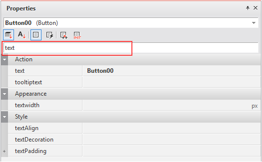 속성창 상단 검색창은 검색어로 입력된 항목을 포함하는 속성 항목을 찾습니다. 검색어로 "text"를 입력하면 속성명에 "text"가 포함된 모든 속성 항목을 보여줍니다.