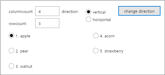 화면에서 아이템(데이터)이 표시되는 방향을 지정합니다. default 값은 "horizontal"입니다. direction 속성에 대한 오해 중 하나가 innerdataset을 설정하고 화면에 표시했을 때 세로 방향으로 데이터가 보이는데 왜 default 값은 "horizontal"이냐는 것입니다. 해당 속성의 정의가 Radio 컴포넌트의 방향이 아니라 아이템이 표시되는 방향을 지정하기 때문입니다. 아래 예제를 보면 좀 더 이해가 빠를 겁니다. columncount 속성값은 3이고 direction 속성값만 변경했습니다.