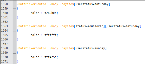 DatePickerControl은 두 부분으로 나눌 수 있습니다. 년도와 월을 표시하며 버튼을 가지고 있는 head, 요일과 날짜를 표시하는 body. 그리고 body는 다시 요일을 표시하는 weekband와 각각의 dayitem으로 구성됩니다.아래 코드에서는 head, weekband 영역의 배경색을 바꾸었고 body 영역의 테두리선을 보이지 않게 했으며, 토요일과 일요일을 다른 날과 같은 색으로 표시하도록 했습니다.