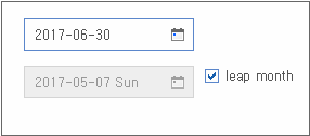 type 속성값이 "normal"인 경우에는 달력 모양 아이콘을 클릭하면 달력이 펼쳐집니다. 원하는 날짜를 클릭해서 선택하면 달력은 사라집니다. type 속성값이 "monthonly"인 경우에는 달력이 펼쳐진 상태입니다. 원하는 날짜를 선택하면 선택된 값을 처리하는 스크립트를 별도 작성해야 합니다. type 속성값이 "spin"인 경우에는 달력 모양 아이콘 대신 날짜값을 이동할 수 있는 스핀 버튼이 나타납니다.