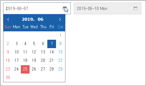 첫 번째 Calendar 컴포넌트는 기본 테마에서 제공하는 휴일 표시이고 두 번째 Calendar 컴포넌트는 금요일, 토요일을 휴일로 표시하고 있습니다.