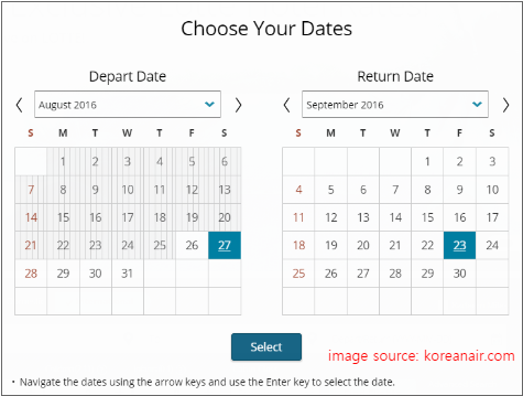 비행기 왕복 티켓을 예매하는 경우에는 현재일자를 기준으로 출발일자와 도착일자를 한눈에 확인하고 선택할 수 있어야 합니다. 달력이 펼쳐진 상태에서 사용자가 바로 날짜를 선택할 수 있습니다.