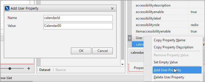 Calendar 컴포넌트의 type 속성값을 'monthonly'로 수정합니다. 컴포넌트의 height 값도 적절히 수정해주어야 합니다. width값과 같은 값으로 설정하면 보기 좋게 출력됩니다. Radio 컴포넌트는 innerdataset 값을 아래와 같이 설정합니다. 이때 false에 해당하는 codecolumn 값은 공백문자로 설정해야 합니다.