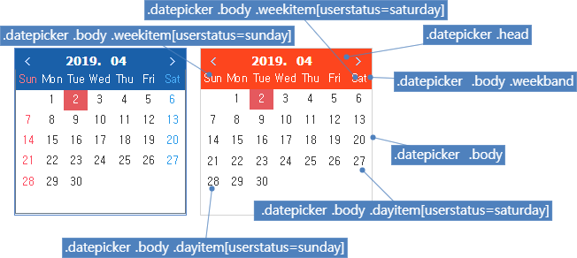 }기본 테마(blue)에서는 아래와 같이 설정되어 있습니다. 테마를 수정할 경우에는 DatePickerControl의 dayitem, weekitem으로 설정할 수 있습니다.