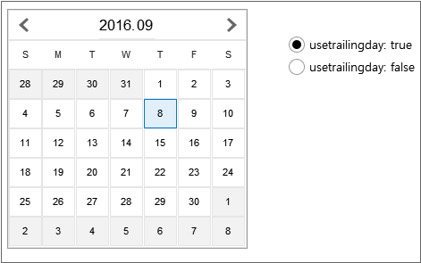 Calendar 컴포넌트는 type 속성값에 따라 화면에 표시되는 모습이 달라집니다. 이번 예제에서는 usetrailingday 속성값이 어떻게 적용되는지 바로 확인하기 위해 type 속성값을 'monthonly'로 설정했습니다.