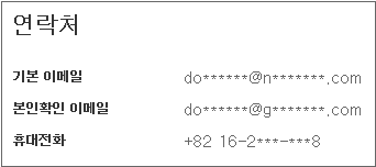 아래는 어느 포털사이트의 개인 정보 조회 화면입니다. 개인 정보 보호를 위해 아이디, 도메인 주소, 전화번호의 일부를 별표(*)로 표시하거나, 번호의 앞에 지역 번호를 붙이는 등 다양한 형식으로의 입, 출력이 가능합니다.