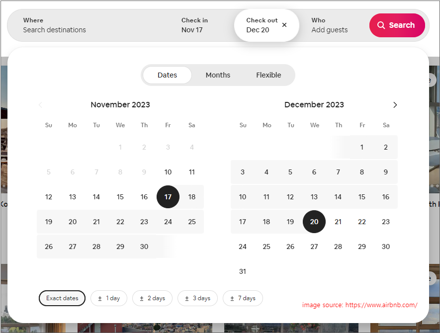 여행 일정을 예약하는 서비스에서는 체크인, 체크 아웃 일정을 설정할 때 2개의 달력을 한눈에 볼 수 있게 표시해 달력을 따로 조작하지 않고도 2개의 일정을 선택할 수 있게 합니다.