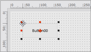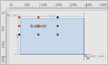 디자인 화면에 배치된 컴포넌트를 클릭합니다. 컴포넌트는 선택된 상태로 변경됩니다. 컴포넌트가 선택된 상태에서는 크기를 변경할때 사용하는 트래커(검은색 또는 빨간색 점)이 표시됩니다. 트래커 위에 마우스포인터를 가져가면 각 트래커에 해당하는 방향 모양으로 마우스 포인터가 변경됩니다.