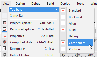 컴포넌트 툴바가 보이지 않는다면 메뉴[View > Toolbars > Component] 항목이 체크되어 있는지 확인하세요. 최초 설치 시에는 체크되어 있지만 작업 중 해당 항목 체크를 취소한 경우에는 컴포넌트 툴바가 보이지 않습니다.