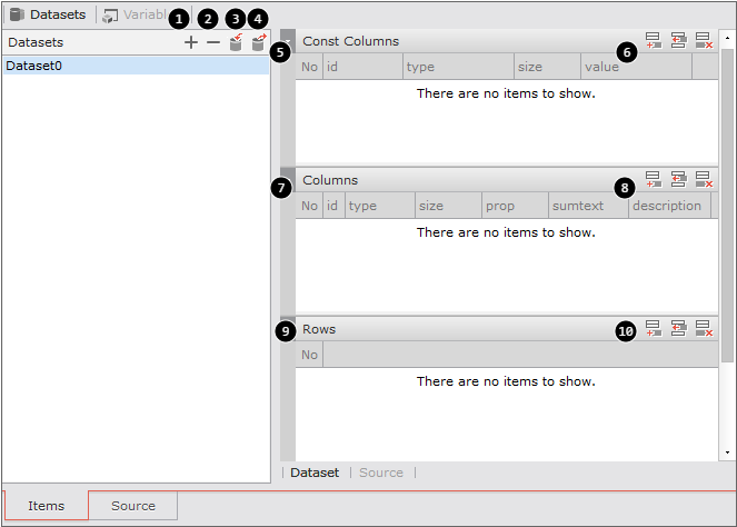 10 | Add row to the dataset Insert row to current position Delete selected row | DatasetRowを追加 カーソルが位置する上段にRowを挿入 DatasetRowを削除 |