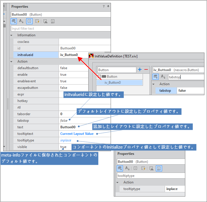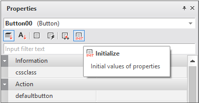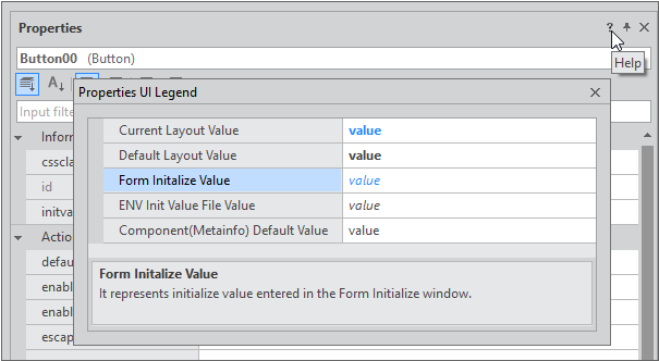 最初のアプリが実行された場合にのみ、指定されたプロパティ値を使用し、以降にはユーザーが入力したり、実行中に変更された値を使用する必要がある場合があります。そのような項目の値は、Init Infoプロパティで別途管理します。プロパティ値のLayout Informationに該当する値を除いた残りの値のうち、一部の項目のみを編集することができます。